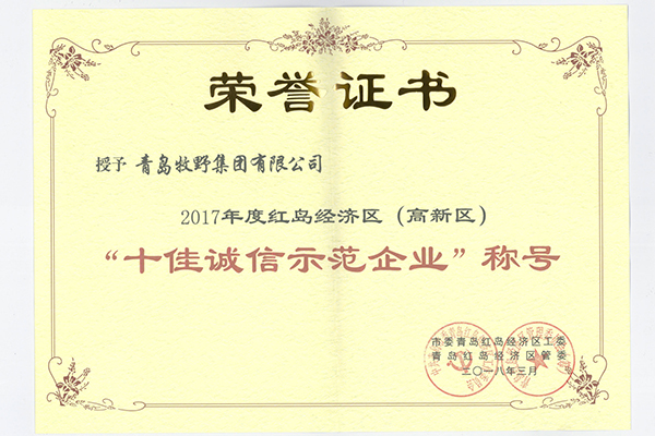 青島牧野集團有限公司獲得市委青島紅島經濟區(qū)工委、青島紅島經濟區(qū)管委聯(lián)合授予的2017年度紅島經濟區(qū)(高新區(qū))“十佳誠信示范企業(yè)”稱號