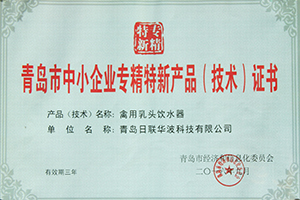 青島日聯(lián)華波科技有限公司禽用乳頭飲水器獲得青島市經(jīng)濟(jì)和信息化委員會(huì)青島市中小企業(yè)專(zhuān)精特新產(chǎn)品(技術(shù))證書(shū);